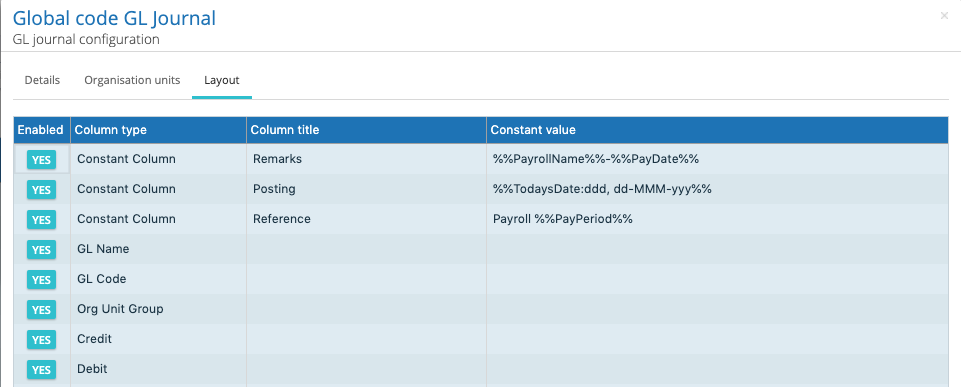 For example %%PayrollName%% will insert the payroll name in the constant column when the report is generated. The pre-defined words have to be exact for the system to retrieve the value. The constant column field can contain more than one key words for example %%PeriodName%% %%PayrollName%% or the key word is combined with some text e.g. %%PayrollName%% GL Journal.
