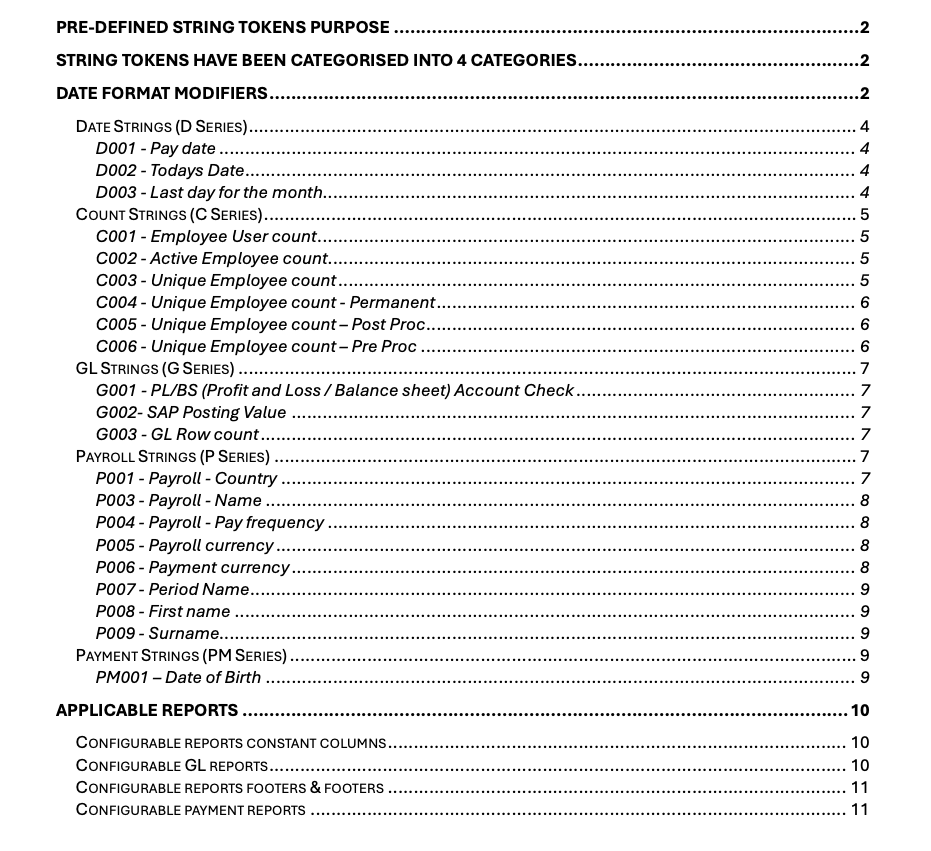 The ‘PayrollCountry’ string token can be included in a report constant column to show the 3-character ISO country code associated with the payroll period being reported.