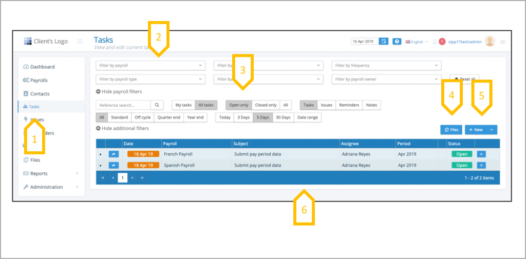2. My Tasks / All Tasks – The number of tasks visible to a user will depend on their user type, user group and payroll group.The task list always opens on My Tasks. To view the tasks assigned to other users click on All Tasks. If you cannot see the tasks you expect to see, check the other filters and the time period you have selected.
