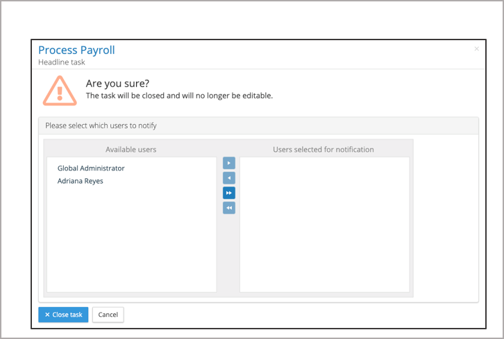 When the close button has been clicked, a new dialogue appears asking you if you are sure. All the users with access rights to the task will be listed,