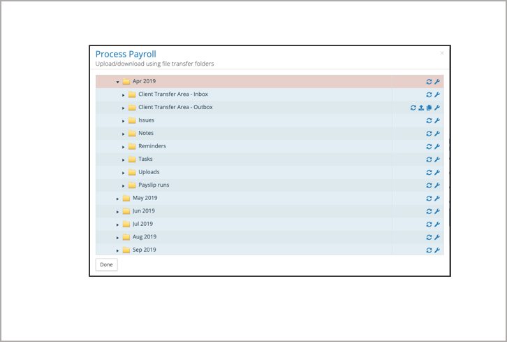 4. Upload/download using file transfer folders – The task action may require placing or retrieving files from the file management system, this opens a new window to the file management system with the file hierarchy displaying the payroll and pay period associated with that task.