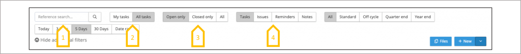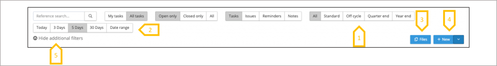 1. All, Standard, Off cycle, Quarter end and Year end – The task list presents All tasks first, to narrow the focus on tasks relating to a specific processing types such as Off-cycle, select the filter required.