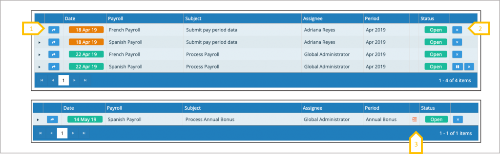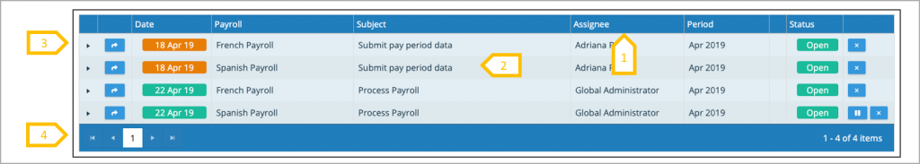 1. Clicking the header of a column the task list can be re-ordered by date, payroll, subject, assignee and period by ascending or descending order.