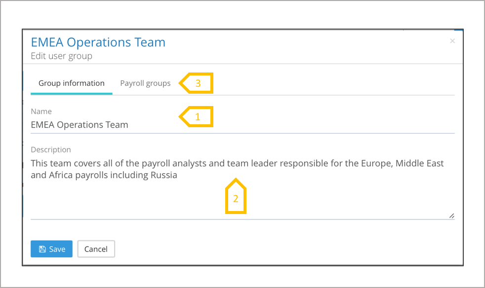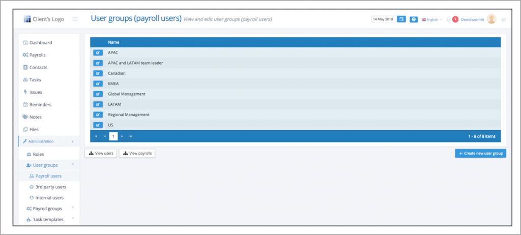 - Click on payroll groups to assign the payroll groups to this user group. If the payroll groups have not been created at this stage revisit the user group to assign the payroll groups.