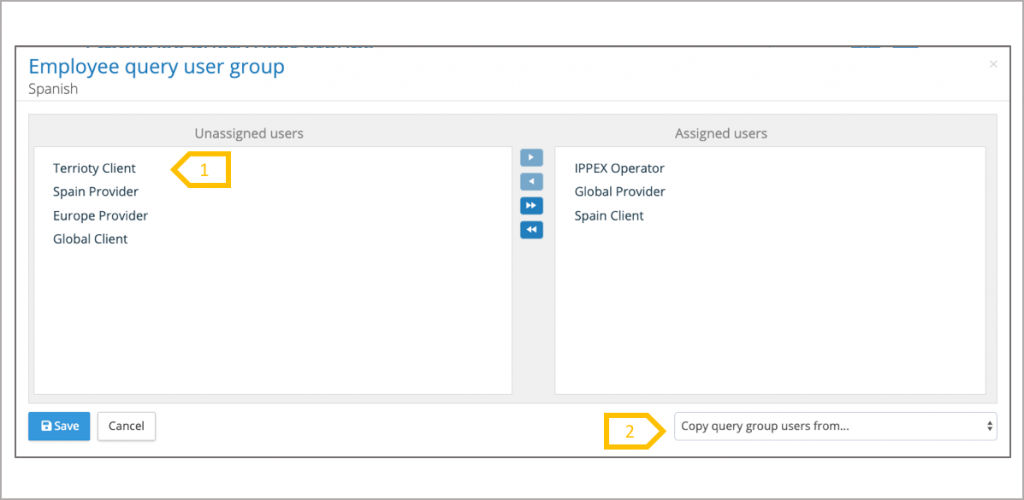- Select the system users who are going to be part of the employee query group. Drag and drop or use the arrows in the central bar to move the users.