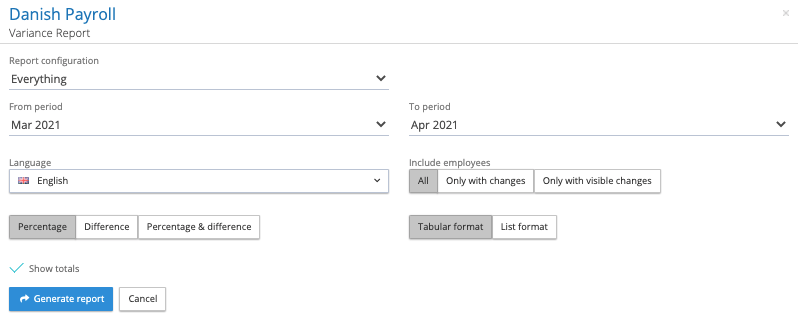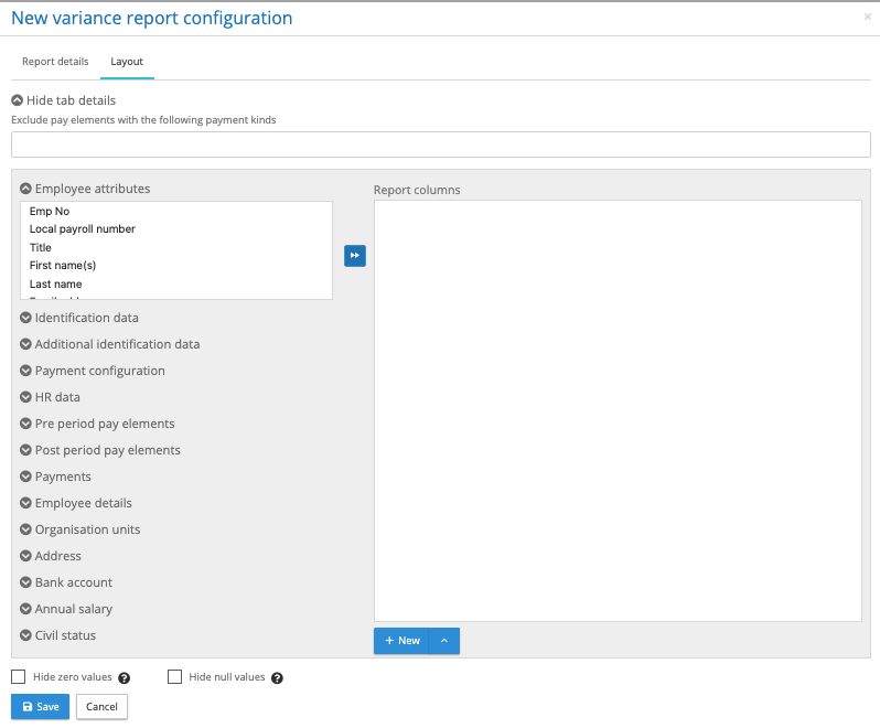 Hide zero values – At the bottom of the report configurator is a checkbox called hide zero values. This will remove any columns from the tabular report where all of the results for a given pay element are zero in both the from period and to period. For the list report any employee with a pay element holding a zero value will be excluded from the report.